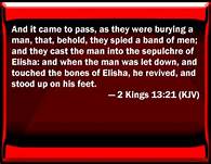 We really see the powerful eternal spirit when Elisha was buried and the band of the Moabites invaded the land, only when they went to bury a man it turned out they had dug up the sepulcher of Elisha and when the man touched Elisha’s bones, he revived, and stood upon his feet!(2 Kings 13:20-21). And Elisha died, and they buried him. And the bands of the Moabites invaded the land at the coming in of the year. And it came to pass, as they were burying a man, that, behold, they spied a band of men; and they cast the man into the sepulchre of Elisha: and when the man was let down, and touched the bones of Elisha, he revived, and stood up on his feet.