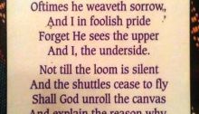 The following is a bookmark I have had for many years, but its message holds true how God knows what we need even when we do not understand.