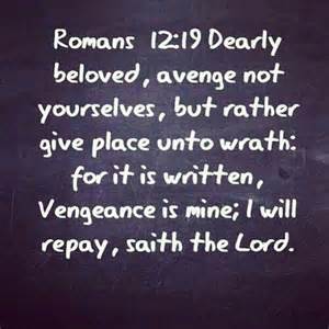We are told in scripture not to avenge ourselves and with good reason, for we are to be examples unto others and have total reliance on God who we know in His time is more than capable of dealing with those who trouble us. (Romans 12:17-21). Recompense to no man evil for evil. Provide things honest in the sight of all men. If it be possible, as much as lieth in you, live peaceably with all men. Dearly beloved, avenge not yourselves, but rather give place unto wrath: for it is written, Vengeance is mine; I will repay, saith the Lord.Therefore if thine enemy hunger, feed him; if he thirst, give him drink: for in so doing thou shalt heap coals of fire on his head. Be not overcome of evil, but overcome evil with good.