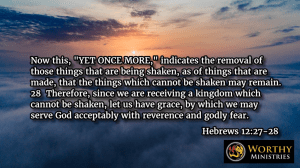 Hebrews 12:26-29 whose voice then shook the earth; but now He has promised, saying, “YET ONCE MORE I SHAKE NOT ONLY THE EARTH, BUT ALSO HEAVEN.” 27 Now this, “YET ONCE MORE,” indicates the removal of those things that are being shaken, as of things that are made, that the things which cannot be shaken may remain. 28 Therefore, since we are receiving a kingdom which cannot be shaken, let us have grace, by which we may serve God acceptably with reverence and godly fear. 29 For our God is a consuming fire.